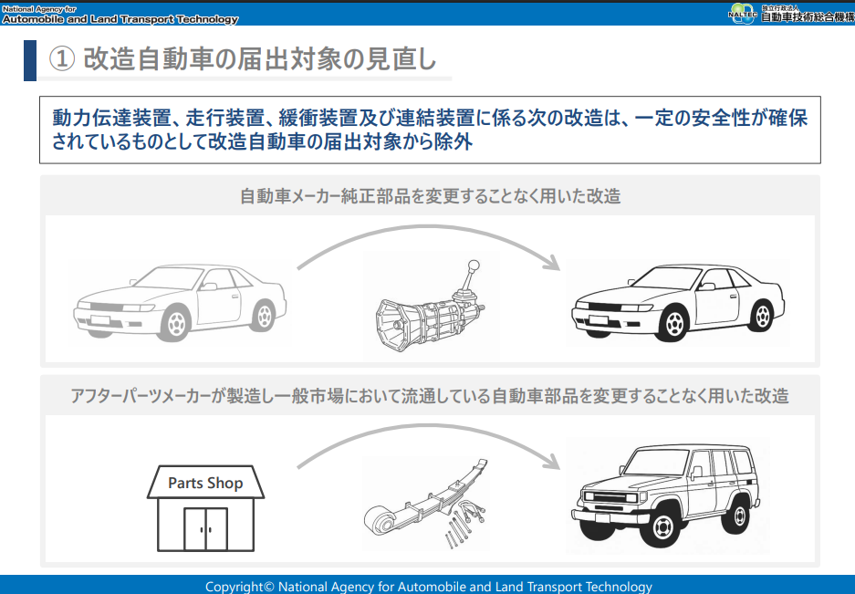 つまり、例えばAT(CVT)⇔MT化、バネサス⇔エアサス化、リーフスプリングやシャックルの変更などの改造に於いて、公認を取得しなくても良い事にしようというものです。