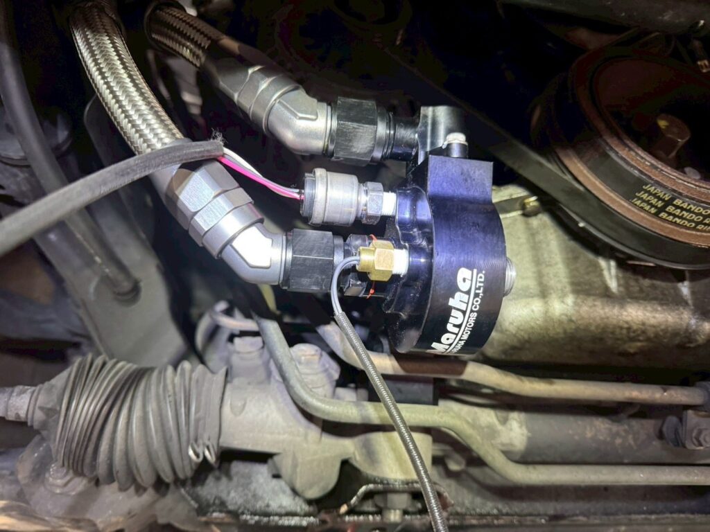 さて、ロードスターでポイントになる油温と油圧の取り出しですが、マルハさんのキットはオイルエレメント移設位置も絶妙の設計です。NA/NBロドスタのオイルエレメントの取付位置は整備性が悪い上にエンジンメンバーにオイルが垂れるのが嫌いなんですよねぇ。。。(洗浄しない場合、エレメント交換で垂れたものなのか、トラブルによる漏れなのかも判断しづらくなる(^^;)